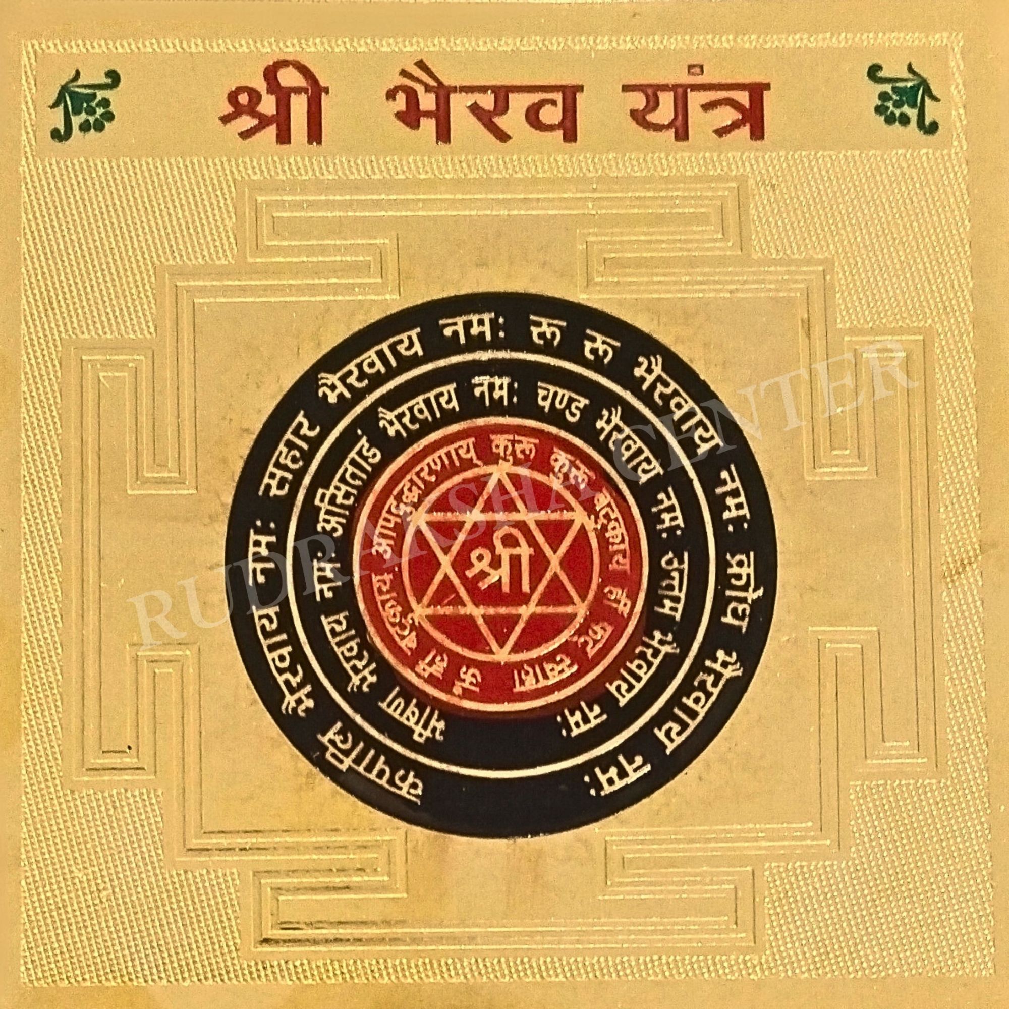 Golden Plated Bhairav Yantra : This Yantra is made on mixed metal plate with Golden Plating and multi colored images. The size available with us is 3x3 inches.