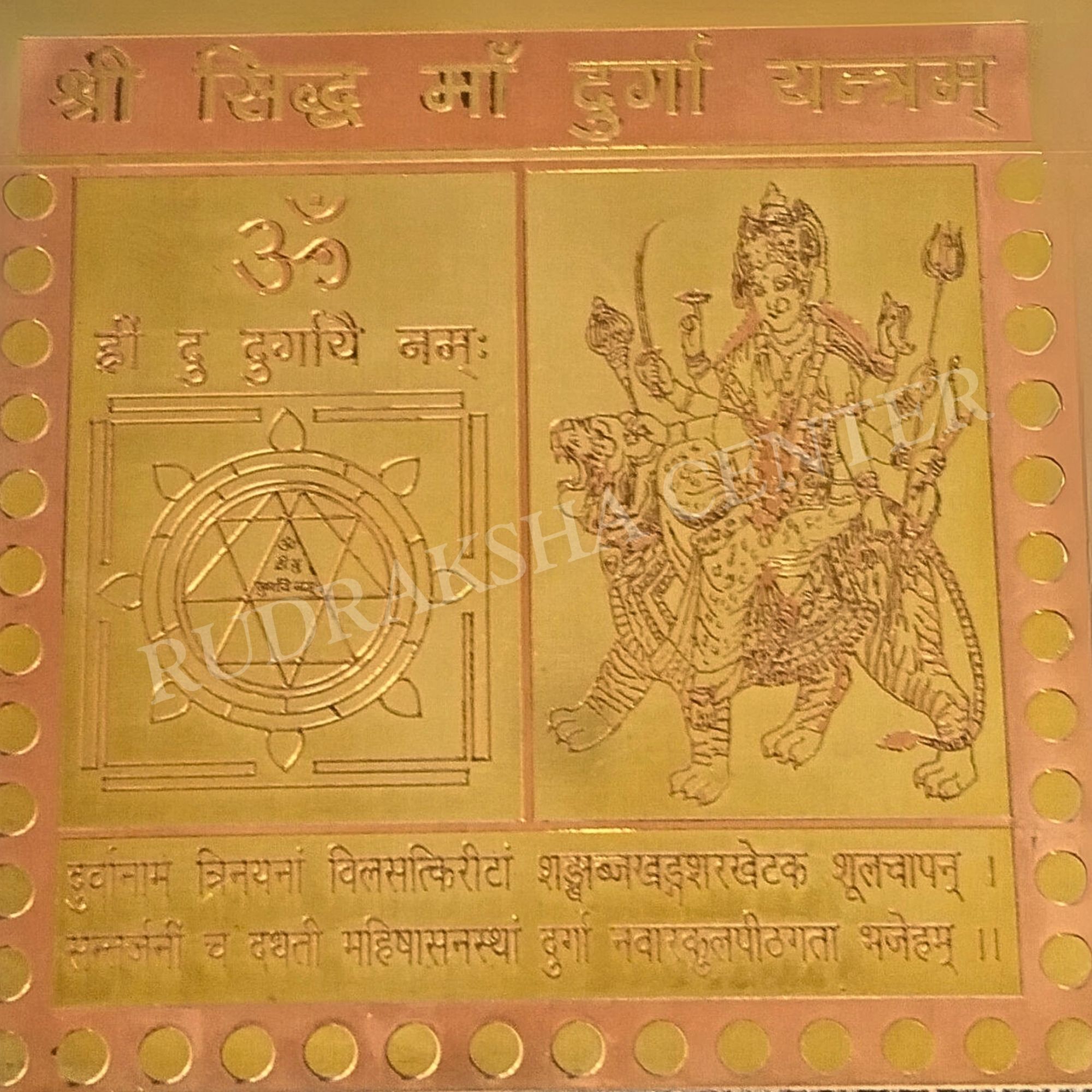 Copper & Golden plated Maha Durga Yantra : This Yantra is made on Copper plate with partial Golden plating on it. The sizes available is 2 x 2 inches.